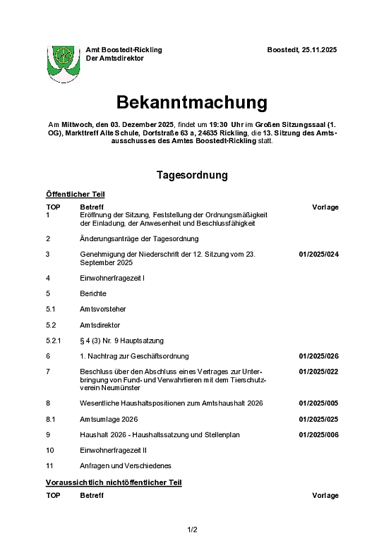 Amtliche Bekanntmachung über die Sitzung des Amtsausschusses am 03.12.2025 - Bereitstellungstag: 25.11.2025