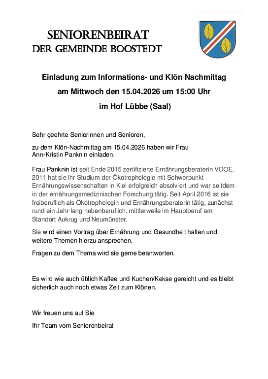 Boostedt: Informations- und Klönnachmittag mti dem Seniorenbeirat