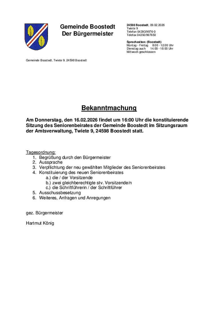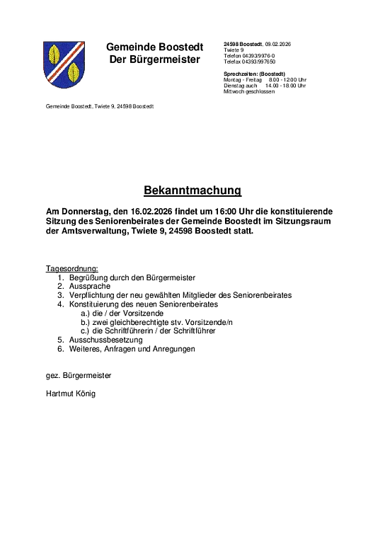 Amtliche Bekanntmachung über die konstituierende Sitzung des Seniorenbeirates am 16.02.2026 - Bereitstellungstag: 10.02.2026
