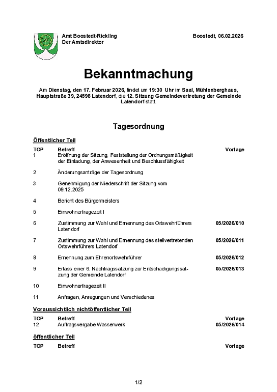Amtliche Bekanntmachung über die Sitzung der Gemeindevertretung am 17.02.2026 - Bereitsstellungstag: 09.02.2026