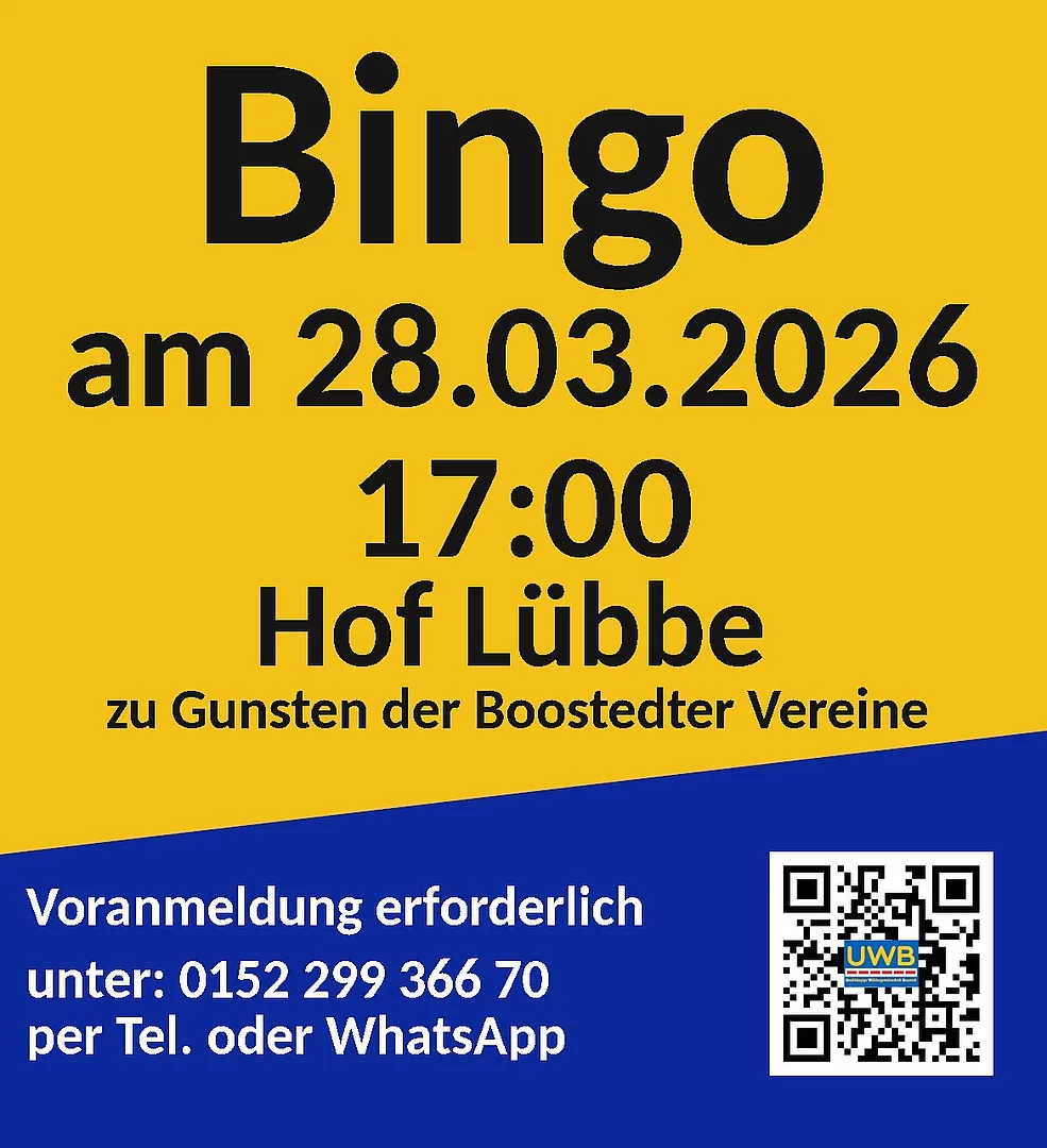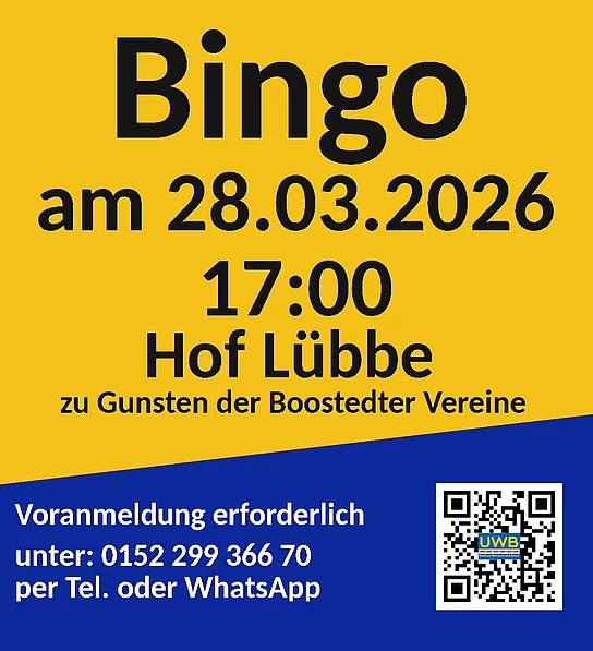 Zur Bingo Veranstaltung sm 28.03.2026 um 17 Uhr im Hof Lübbe lädt die Unabhängige Wählergemeinschaft Boostedt e.V. ein.
