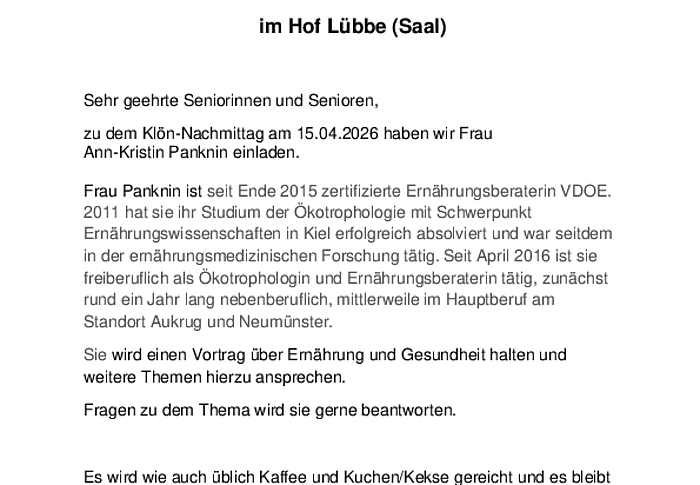 Boostedt: Informations- und Klönnachmittag mti dem Seniorenbeirat